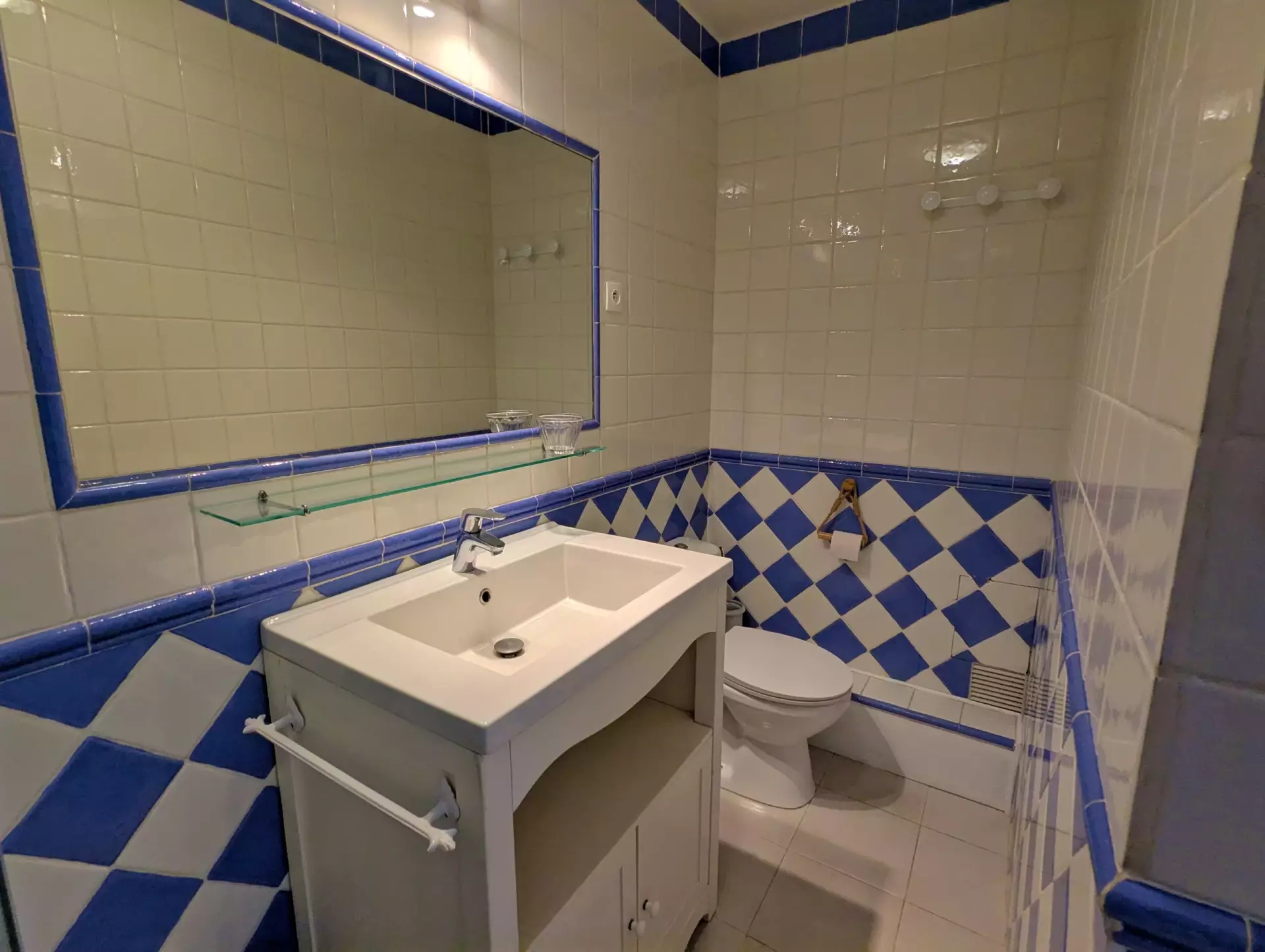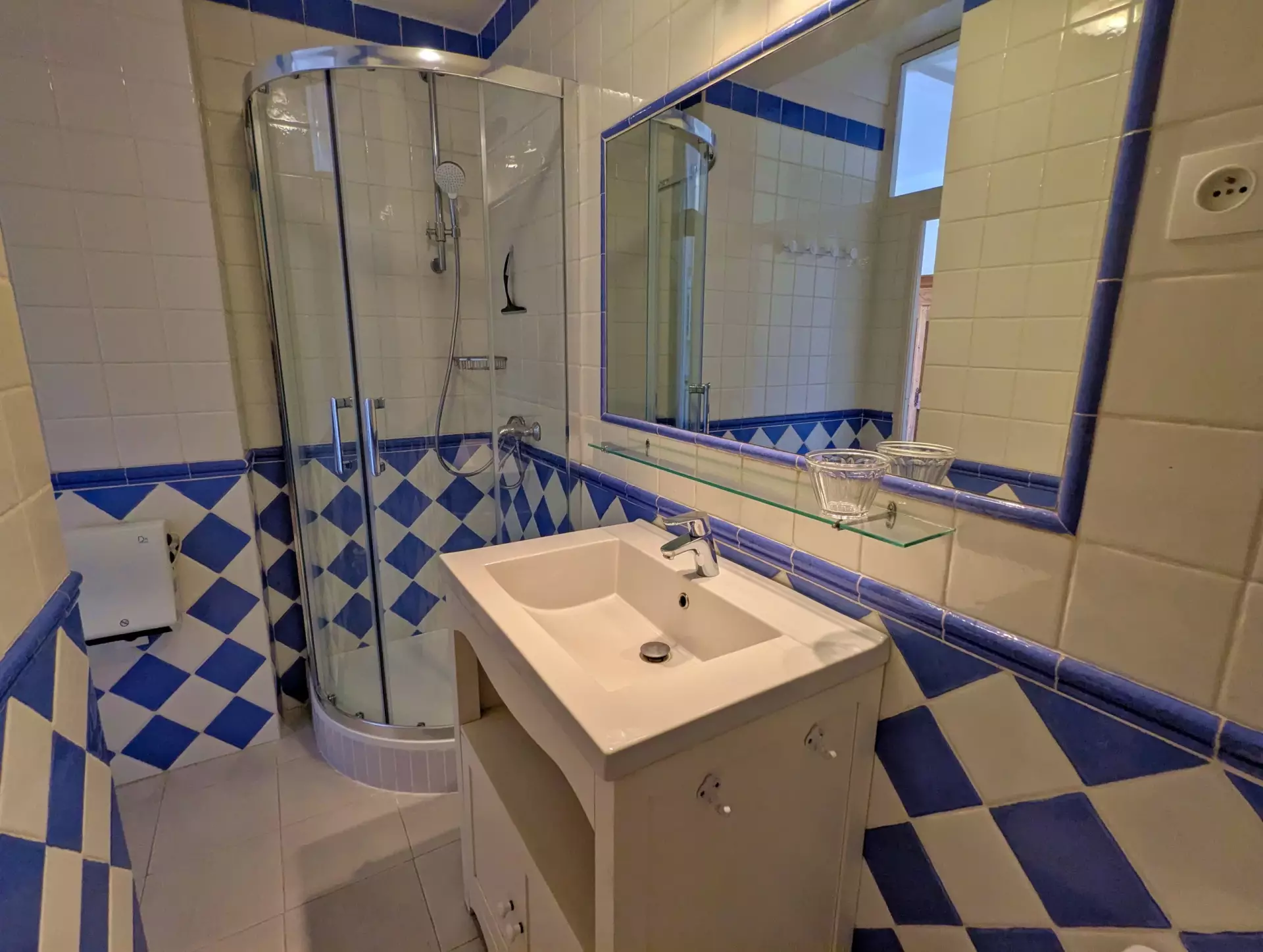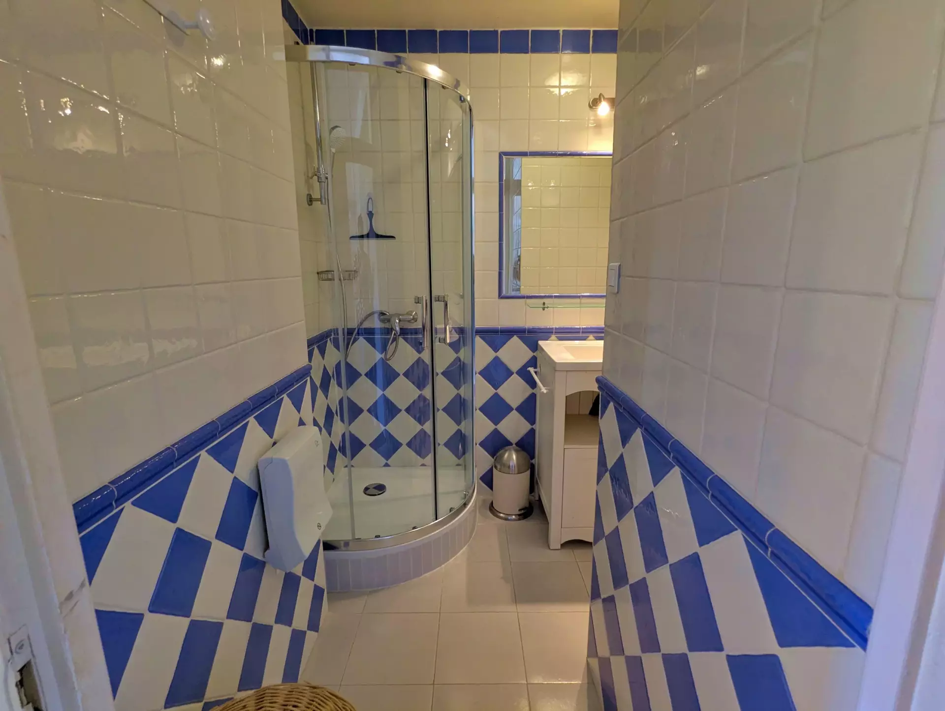 La salle d’eau, aux carreaux bleus et blancs qui rappellent la mer toute proche, comprend une douche, un lavabo, un WC et des rangements simples.