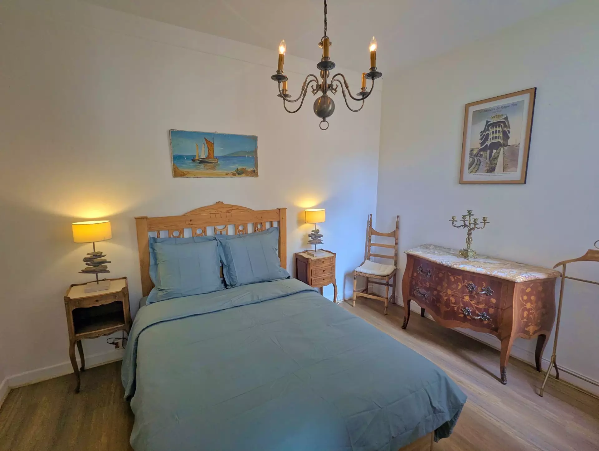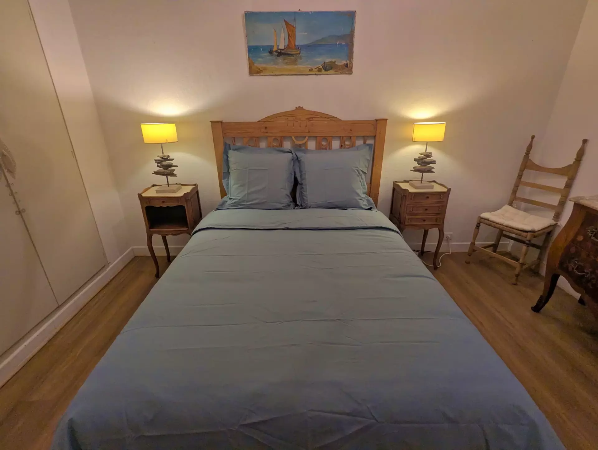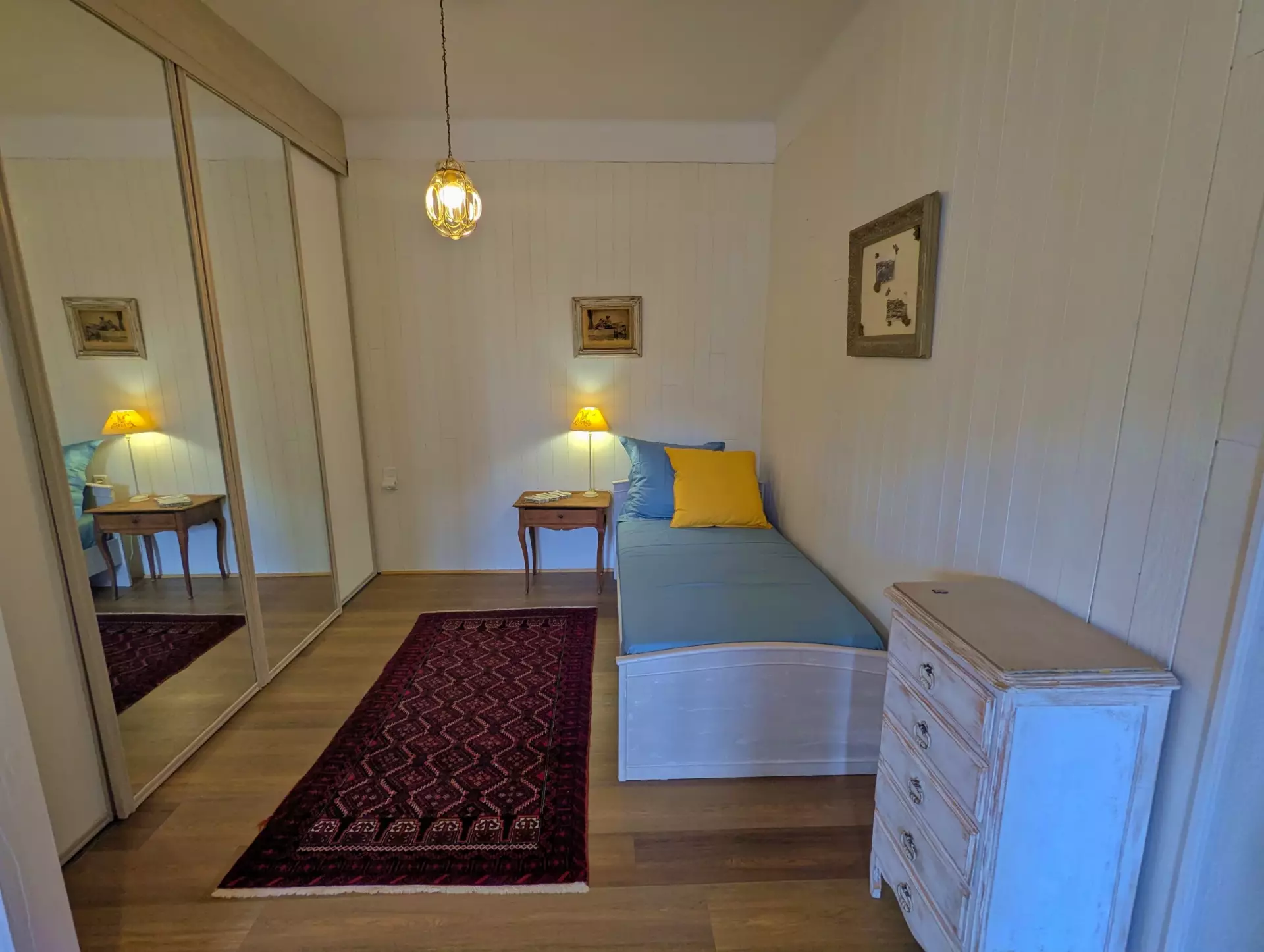 La chambre principale propose un lit double (140×190) et un lit simple (90×190), dans une ambiance douce et authentique. Un canapé-lit est également présent dans le salon, mais n’est pas encore équipé en linge de lit (capacité actuelle : 3 personnes).