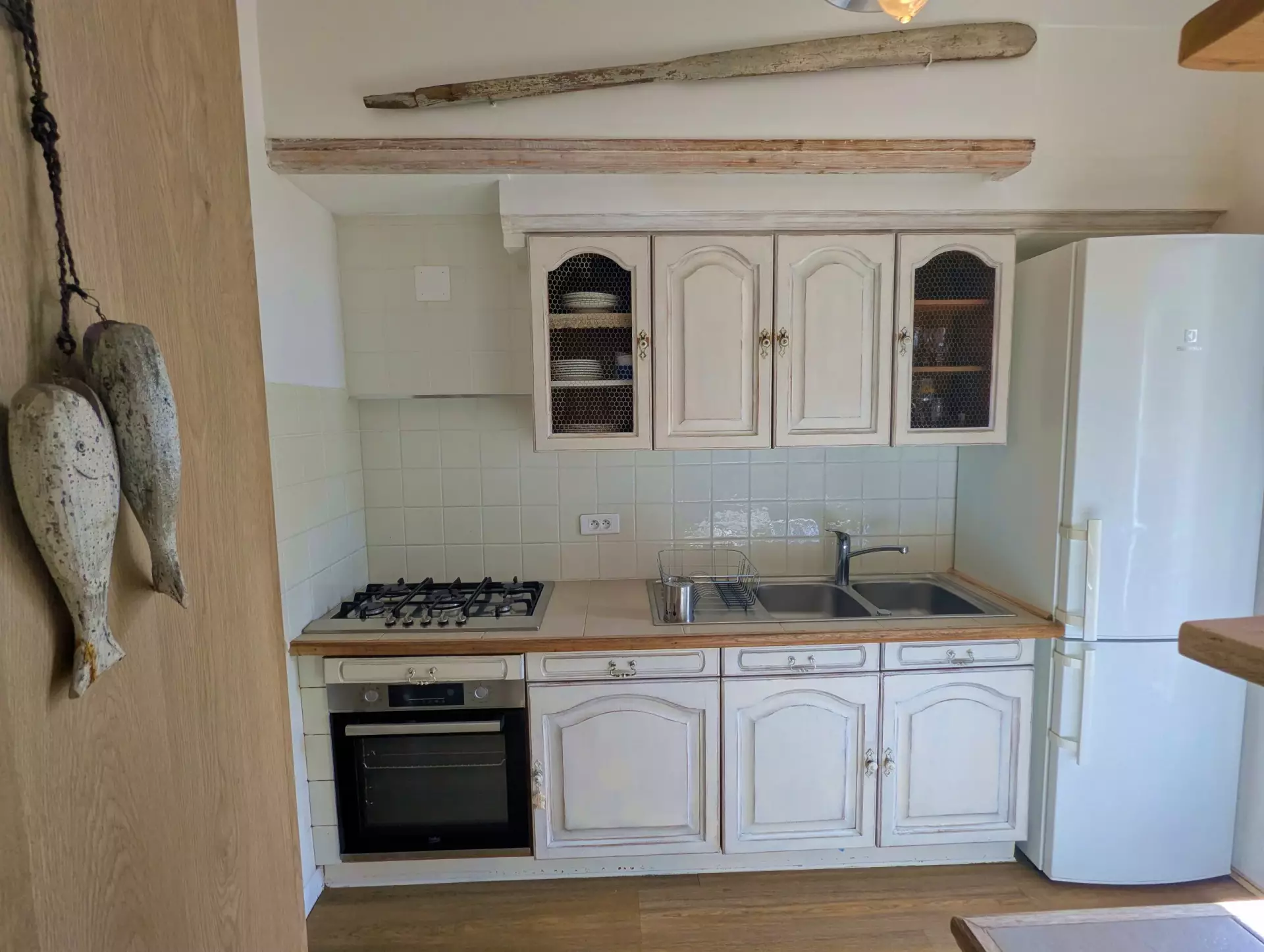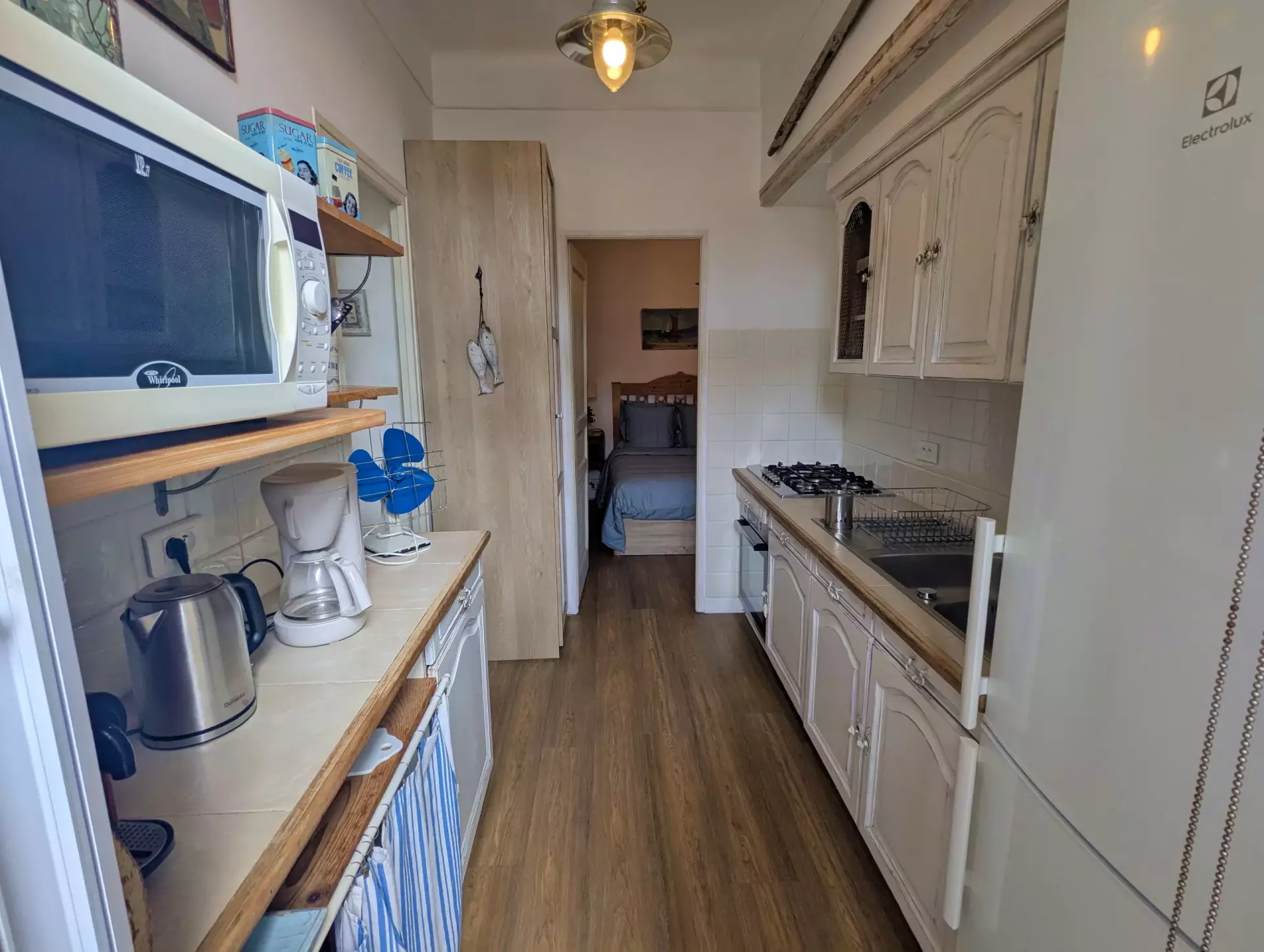 La cuisine, équipée et fonctionnelle, dispose de tout le nécessaire pour préparer vos repas : plaque gaz, four, frigo/congélateur, micro-ondes, cafetière et vaisselle. Elle s’ouvre directement sur la terrasse, pour vivre dedans-dehors en toute simplicité.