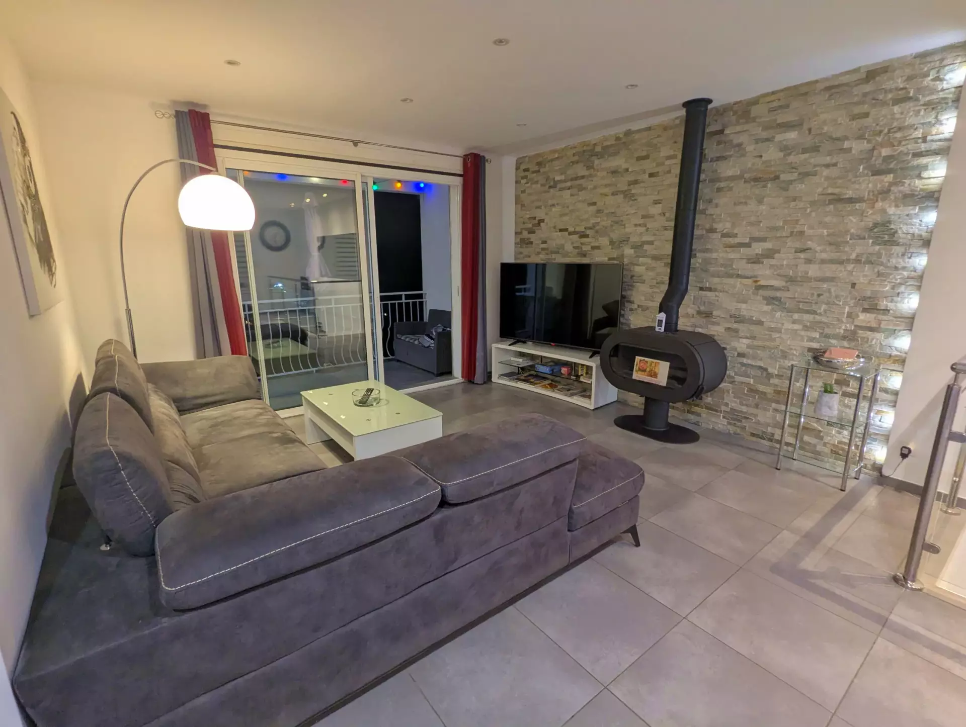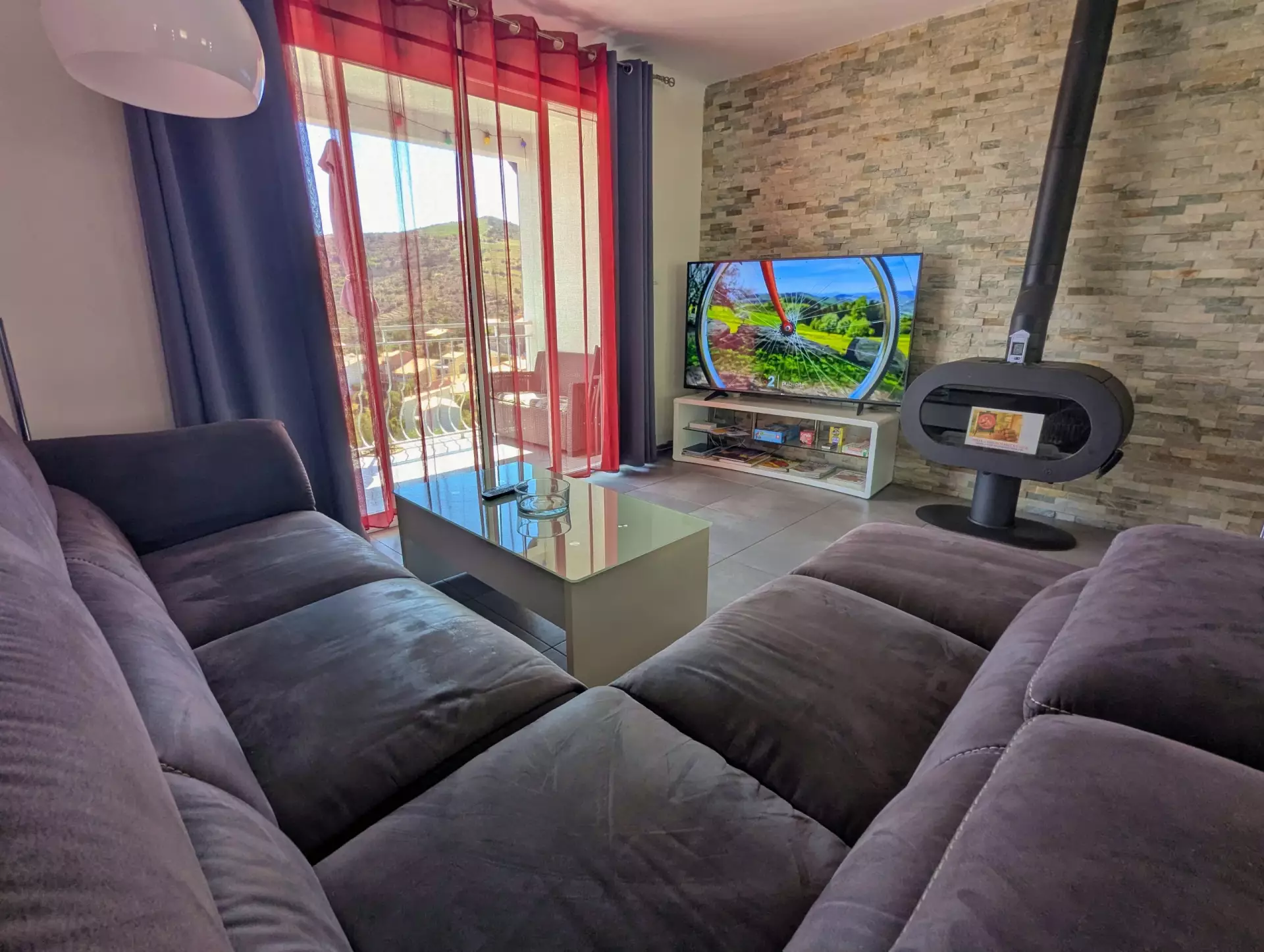 - Grand séjour baigné de lumière : canapé d’angle, TV écran plat, climatisation réversible.